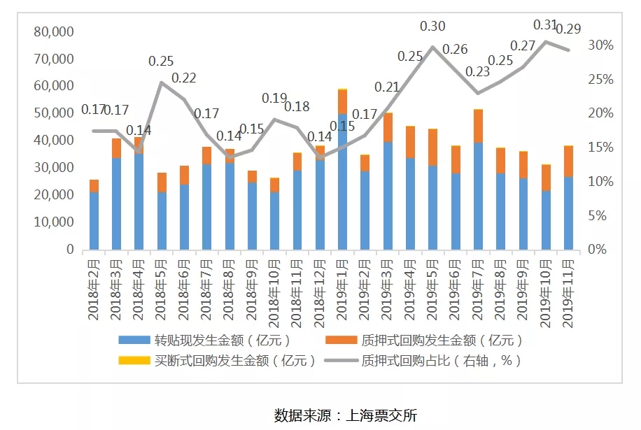 2019年票据资产流动性得到改善,据票交所数据可知,全年票据交易量在50.94万亿(日均2046亿),较2018年上涨约22%。根据1-11月公布的数据,质押式回购业务在全年交易规模中的占比抬升,并在下半年多次突破30%,说明汇票的交易环节中有30%的规模开始服务于机构的资金融通业务。