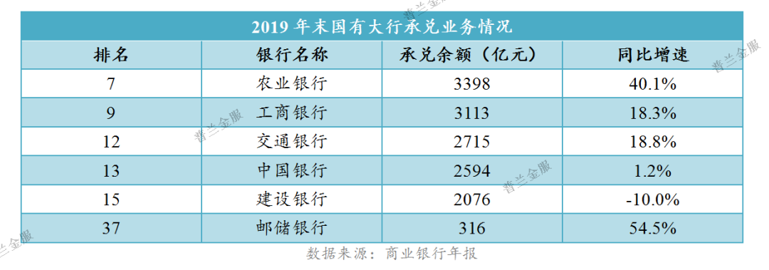 国有大行是银票承兑业务的第二梯队。2019年末,样本中6家国有大行承兑余额为1.42万亿元,同比增长14.5%,在样本承兑余额中的占比为17.7%。国有大行虽然总体承兑余额比不上城商行,但单家银行的承兑余额还是远高于城商行。