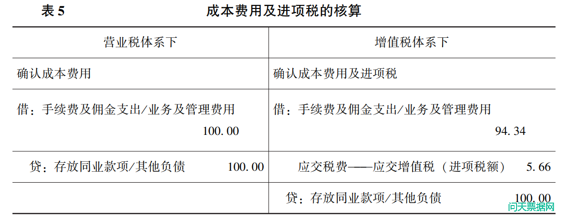 3. 成本费用及进项税的核算。在营业税体系下无可抵扣进项税, 在增值税税制下, 可抵扣进项税的成本费用主要包括手续费支出和部分营业费用, 由于可抵扣进项税的成本费用会计核算相似, 对其在营业税和增值税体系中的会计核算举例如下, 在计算增值税时, 采用 6% 的税率进行核算(见表 5)。