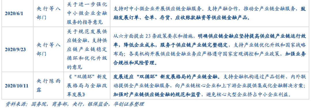 2020年9月,决策层从六方面提出23条政策,稳步推动供应链金融规范、发展和创新,并加强了对供应链金融的监管约束。