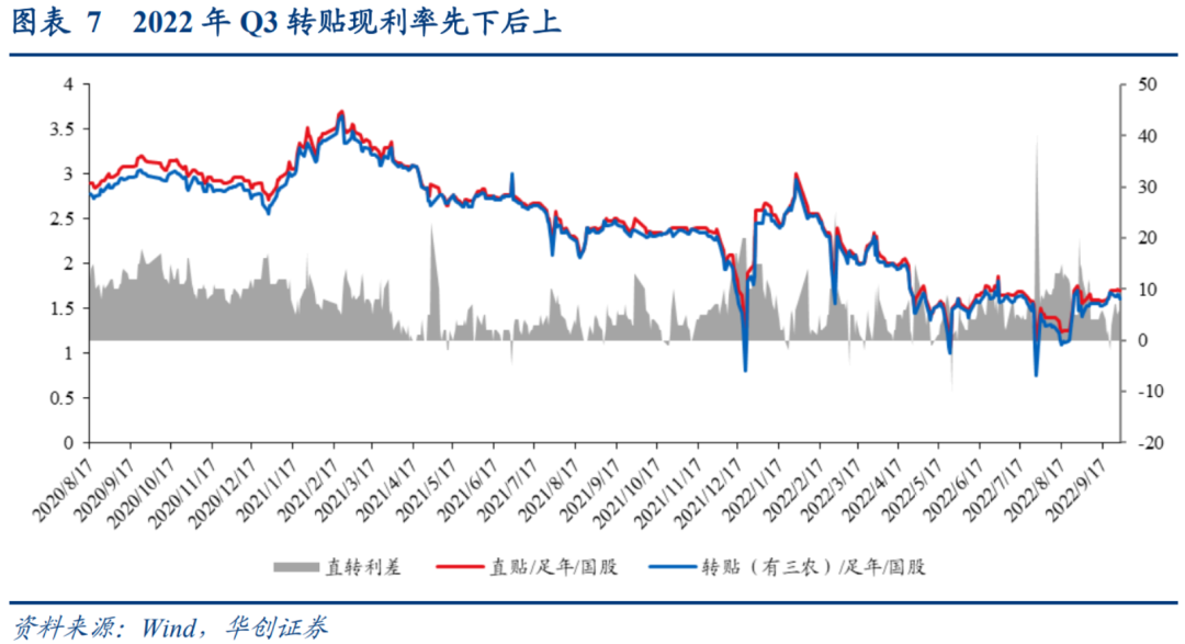融资需求进入边际改善阶段,直贴利率先下后上。2022年7月,在房地产风险事件、疫情反复的影响下企业开票需求明显弱化,银行信贷冲量诉求较强,足年国股直贴利率下行至1.2%;8月企业开票需求边际改善,承兑发行额上行至2.2万亿,“票贷比”监管因素导致银行贴现意愿偏弱,票据承兑增加后大部分留在表外,下旬足年国股直贴利率大幅拉升至1.7%;9月以来融资需求继续边际改善,导致直贴利率盘整,并未再回落至相对低位。