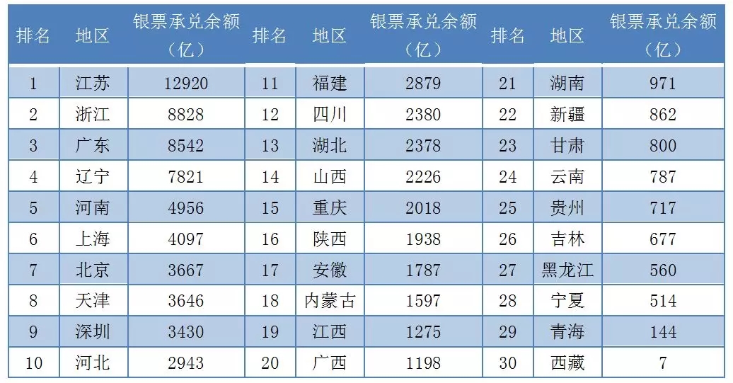 银票承兑余额代表着该地区的银票存量,存量越多的地区是票据直贴的重点区域。2018年末银票承兑余额统计中江苏省、浙江省和广东省排名前三。江苏连续多年位列首位。