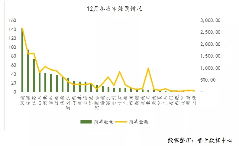 12月罚单数量较多,大额罚单数量也有所上升,其中百万罚单开出19张,合计金额4270.00万元。